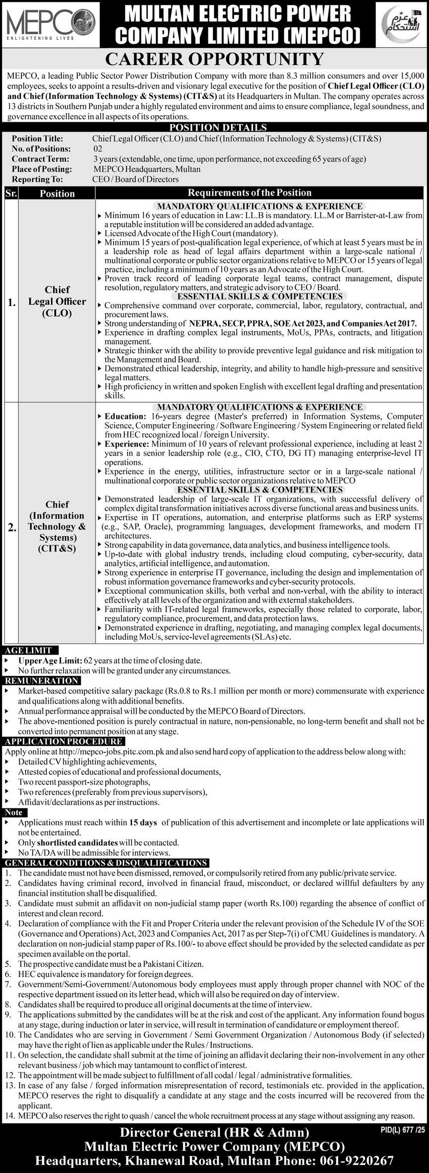 Vacant posts including clo, chief information technology systems, cit&s, chief information technology officer and chief legal officer are announced in Multan Electric Power Company MEPCO Khanewal Road Multan, multan Punjab Pakistan as per 20 September 2025 advertisement in daily Express Newspaper. Preferred Education is LLM, LLb and Master etc.