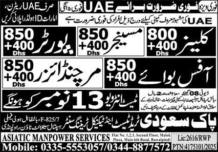 Pak Saudi Trade Test & Technical Training Center jobs advertisement dated about 5 November 2025 in daily Express Newspaper invites application for the vacant post of merchandiser, porter, office boy, messenger and cleaner in Abu Dhabi, sharjah UAE. Candidates with Others, DAE, Matric and Intermediate etc. educational background will be preferred.