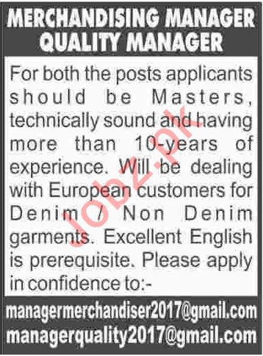 Merchandising Manager & Quality Manager Jobs In Karachi