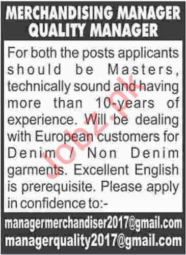 Latest Denim Garments Factory Management Posts Karachi 2025