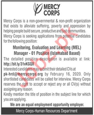Vacancies in Mercy Corps Pakistan Advertisement February 2020