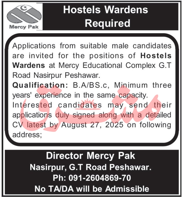 Mercy Educational Complex invites applications for job positions advertised in daily Mashriq dated 26 August 2025 for following vacancies in Peshawar, peshawar Khyber Pakhtunkhwa KPK Pakistan.