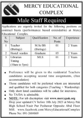 Vacant posts including librarian, teacher, hostel warden and biololgy teacher are announced in Mercy Educational Complex Peshawar, peshawar Khyber Pakhtunkhwa KPK Pakistan as per 8 July 2023 advertisement in daily Mashriq Newspaper. Preferred Education is Bachelor and Master etc.