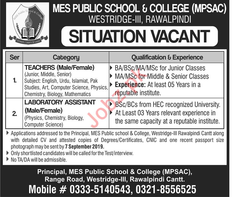 Vacancies in MES Public School & College Advertisement September 2019