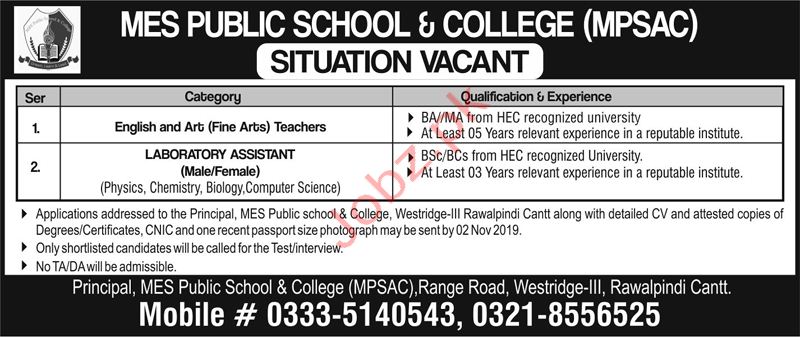 Vacancies in MES Public School & College Advertisement October 2019