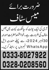 Pakistan Army jobs advertisement dated about 16 November 2024 in daily Express Newspaper invites application for the vacant post of mess staff in Sialkot, sialkot Punjab Pakistan. Matric and Middle etc. educational qualification will be preferred.
