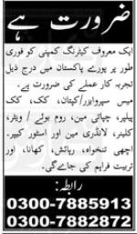 Catering Company Hyderabad, hyderabad Sindh Pakistan invites applications from eligible candidates for the post of mess supervisor, room boy, cook helper, cook, cleaner, laundry man, store keeper and waiter as per advertisement of June 6, 2025 published in daily Kawish Newspaper. Educational qualifications required Matric, Middle and Intermediate etc.