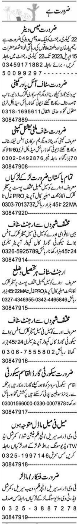 Private Company jobs advertisement dated about 7 April 2023 in daily Express Newspaper invites application for the vacant post of call computer operator, clerk, field staff, call operator, model, office staff, manager, pro, driver, naib qasid, actor, mess waiter, public relation officer, accountant, supervisor guard, helper and security guard in Rahim Yar Khan, rahim yar khan Punjab Pakistan. Candidates with Matric, Middle, Intermediate and Bachelor etc. educational background will be preferred.