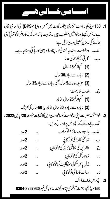 Mess Waiter Job At 150 Medium Regiment Artillery Peshawar