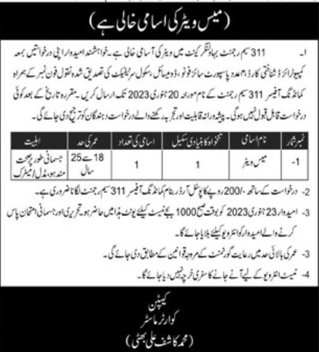 Mess Waiter job at 311 Saim Regiment Bahawalnagar Cantt