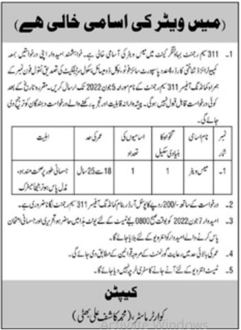 Vacant posts including mess waiter are announced in Pakistan Army Bahawalnagar, bahawalnagar Punjab Pakistan as per 2 June 2022 advertisement in daily Khabrain Newspaper. Persons with Middle and Matric etc. education can apply.