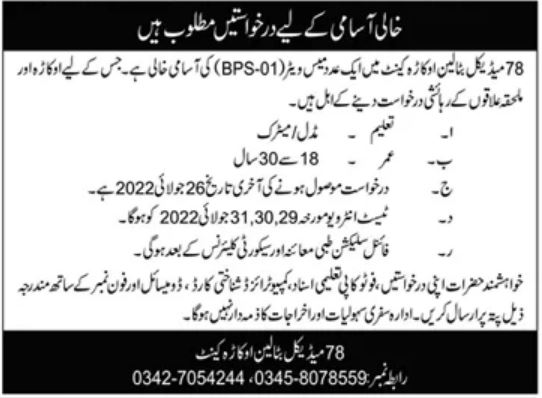 Mess Waiter Jobs 2022 in 78 Medical Battalion Okara Cantt