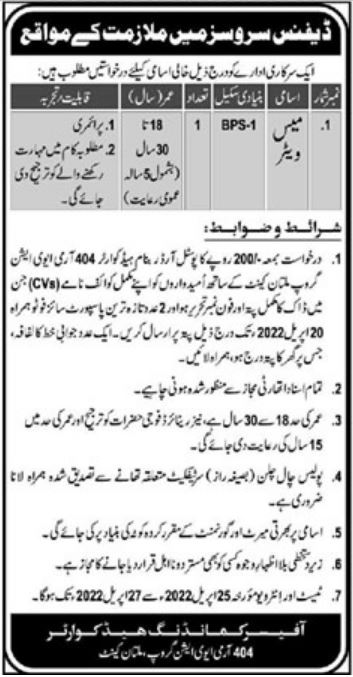 This job is based at Pakistan Army department at 404 Army Aviation Group, Multan Cantt.