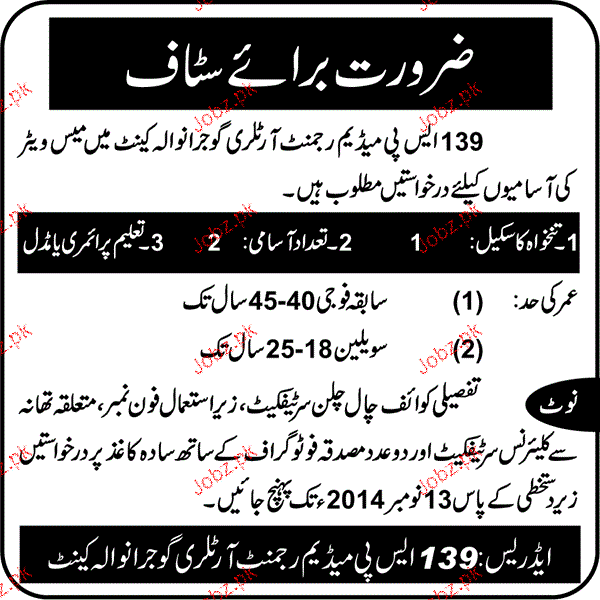 Mess Waiters Job In 139 SP Medium Rejment Artellary