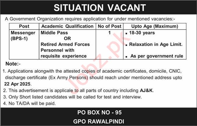 Government Organization Rawalpindi, rawalpindi Punjab Pakistan invites applications from eligible candidates for the post of messenger as per advertisement of April 6, 2025 published in daily Express Newspaper. Preferred Education is Middle etc.