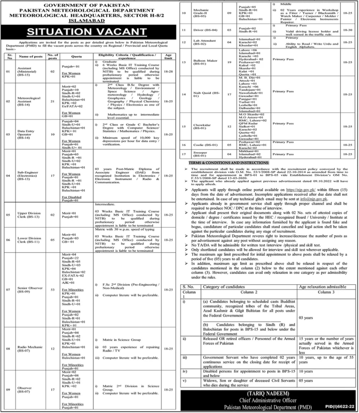 Vacancies in Pakistan Meteorological Department Advertisement May 2023