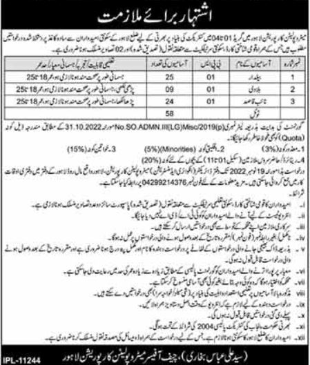Metropolitan Corporation is looking for candidates for following posts as per job advertisement published in daily Dunya Newspaper of November 3, 2022 for location Lahore, lahore Punjab Pakistan: