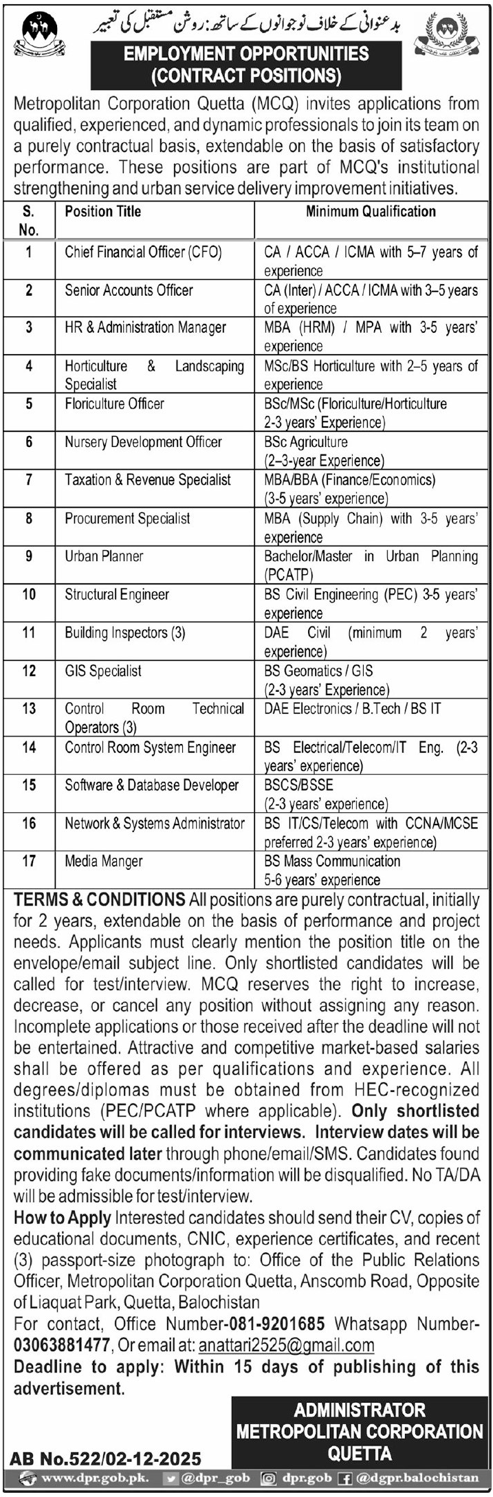 Metropolitan Corporation jobs advertisement dated about 3 December 2025 in daily Express Tribune Newspaper invites application for the vacant post of media manager, control room technician operator, gis specialist, administration manager, cfo, revenue specialist, chief financial officer, structural engineer, horticulture specialist, landscaping specialist, accounts officer, hr manager, systems administrator, nursery development officer, database developer, network administrator, urban planner, taxation specialist, building inspector, procurement specialist, control room system engineer, software developer and floriculture officer in Quetta, quetta Balochistan Pakistan. Preferred Education is Others, BBA, BCS, M.sc, CA, BIT, DAE, Intermediate, Bachelor, ACCA, MBA and Master etc.