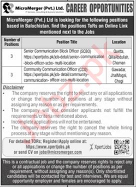 Micro Merger Pvt Limited Quetta, quetta Balochistan Pakistan invites applications from eligible candidates for the post of community communication officer cco and communication block officer as per advertisement of November 18, 2024 published in daily Jang Newspaper. MS, Master and Bachelor etc. educational qualification will be preferred.
