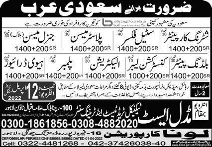 Middle East Technical Trade Test & Training Center jobs advertisement dated about 10 April 2022 in daily Express Newspaper invites application for the vacant post of general mason, shuttering carpenter, steel fixer, plaster mason, driver, htv driver, plumber, electrician, construction labor and building painter in Makkah, makkah Saudi Arabia. Primary, Matric and Middle etc. educational qualification will be preferred.