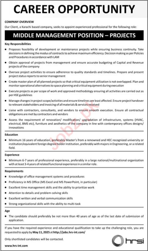 Human Resource Solution International HRSI Clifton Karachi, karachi Sindh Pakistan invites applications from eligible candidates for the post of middle management position as per advertisement of April 27, 2025 published in daily Jang Newspaper. Bachelor and Master etc. educational qualification will be preferred.