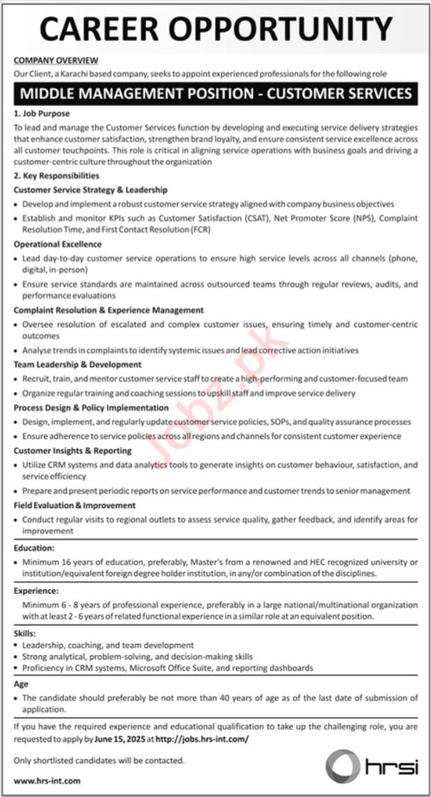 Human Resource Solution International HRSI invites applications for job positions advertised in daily Jang dated 1 June 2025 for following vacancies in Karachi, karachi Sindh Pakistan.