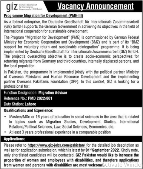 GIZ Pakistan Lahore, lahore Punjab Pakistan invites applications from eligible candidates for the post of migration advisor as per advertisement of August 19, 2022 published in daily The News Newspaper. Candidates with Master and M.sc etc. educational background will be preferred.