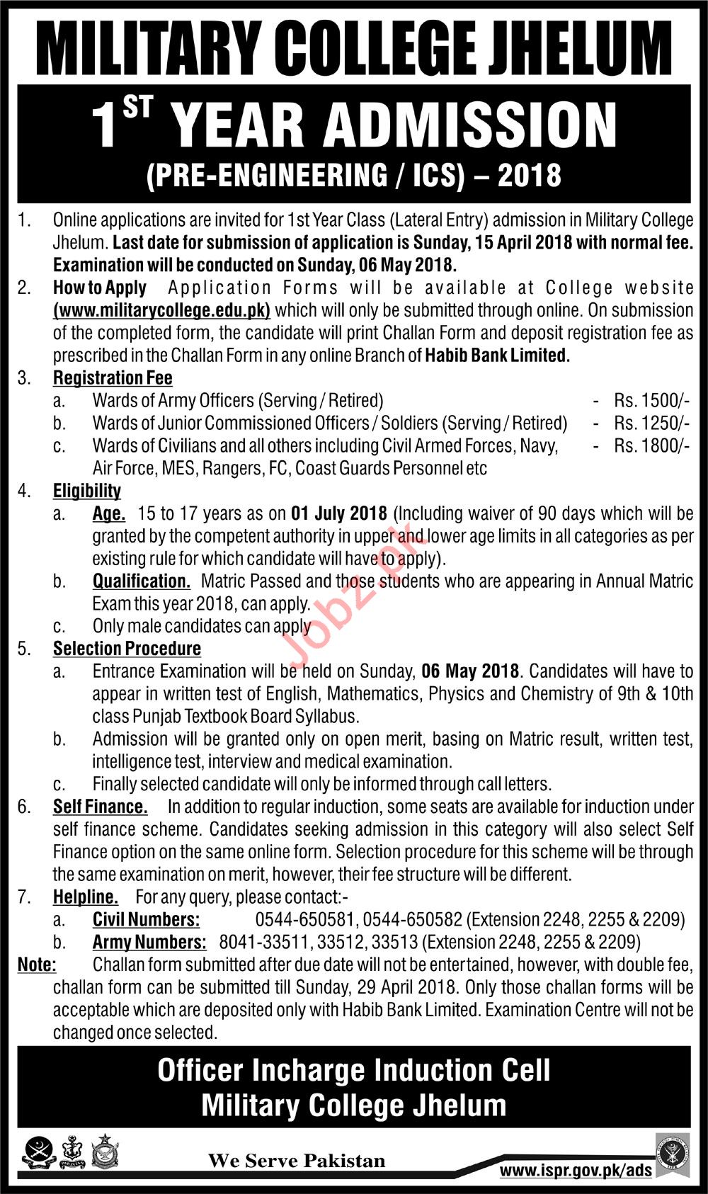 Military College Jhelum, Pakistan Army, Pakistan open admissions session 2018 to 2019 for the classes of 1st Year (Pre Engineering, ICS). Last date for submission of application form is 15th April 2018. Read newspaper ad for exact details.
