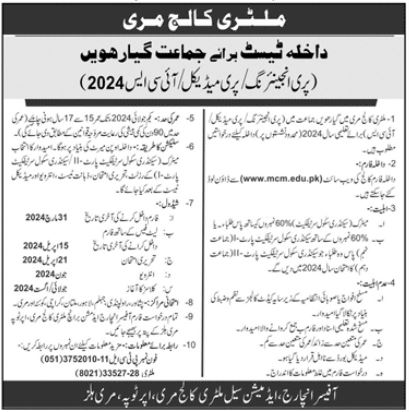 Military College Fsc Pre Medical, Fsc Pre Engineering, ICS Computer Science admissions 2024 has been announced. Eligible students who qualify as per admission criteria in Military College Murree Punjab Pakistan can apply in Science College for academic year 2024. Students for admissions in ICS and Intermediate can apply for online or campus classes as per Government institute criteria till admission closing date March 31, 2024. Read newspaper ad for exact details.
