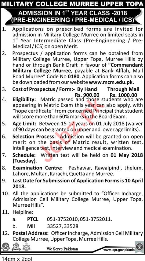 Military College Murree Upper Topa, Pakistan announces admissions 2018 for the classes of Pre Engineering, Pre Medical and ICS. Last date for submission of admission form is 10th April 2018. Read newspaper ad for exact details.