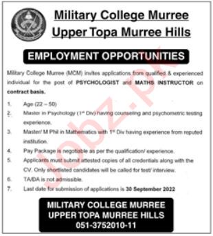 Military College Murree, murree Punjab Pakistan invites applications from eligible candidates for the post of psychology instructor and maths instructor as per advertisement of September 18, 2022 published in daily Jang Newspaper. Preferred Education is etc.
