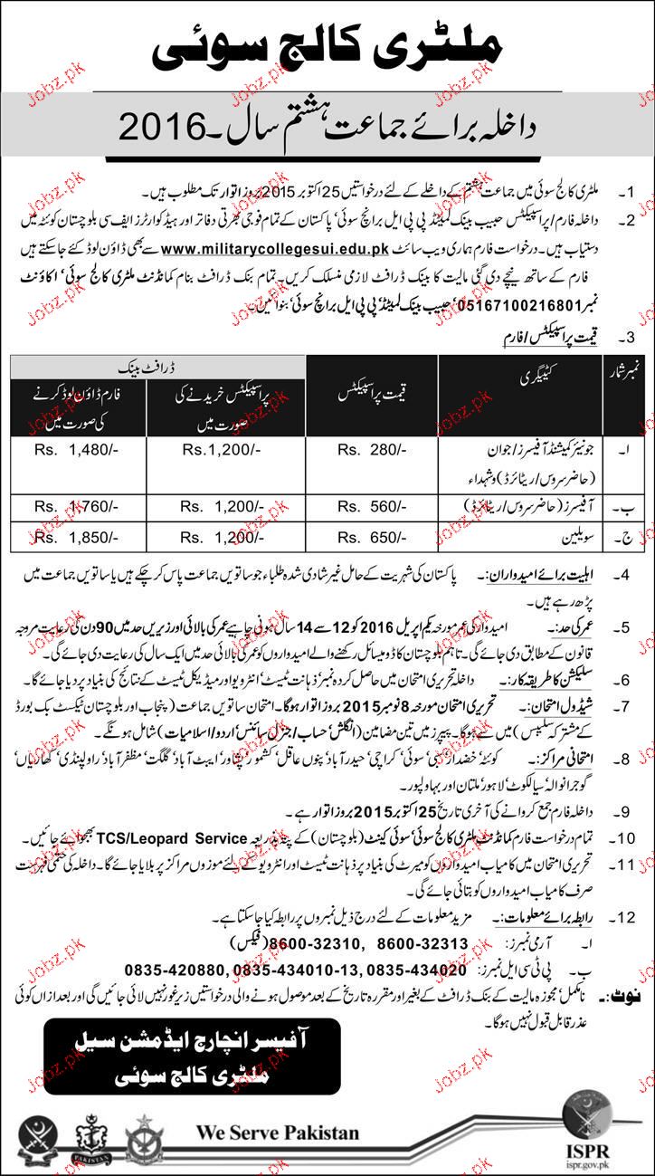Military College Sui Admission in Class VIII in Sui. Read newspaper ad for exact details.