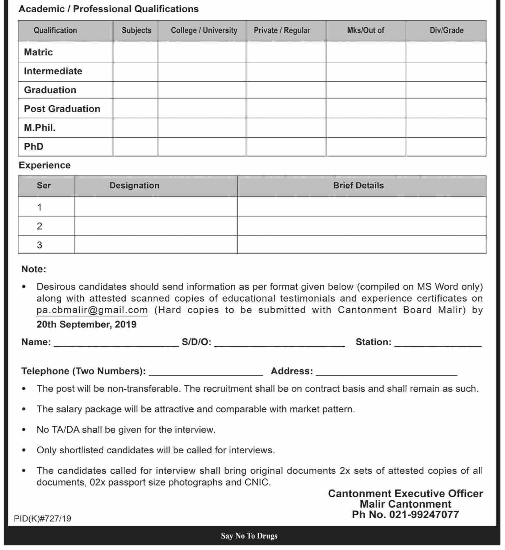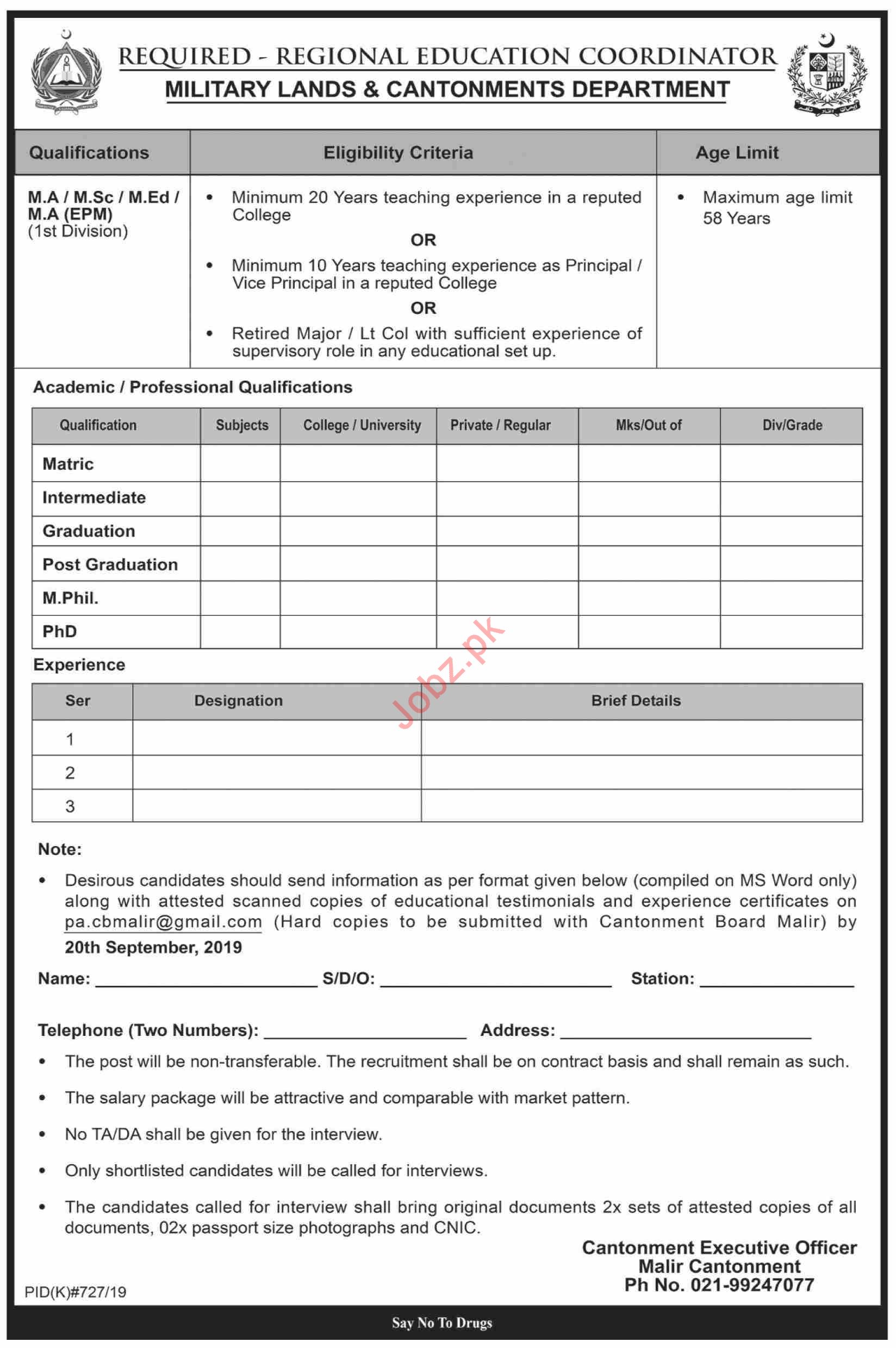 Vacancies in Military Lands and Cantonment Department Advertisement September 2019