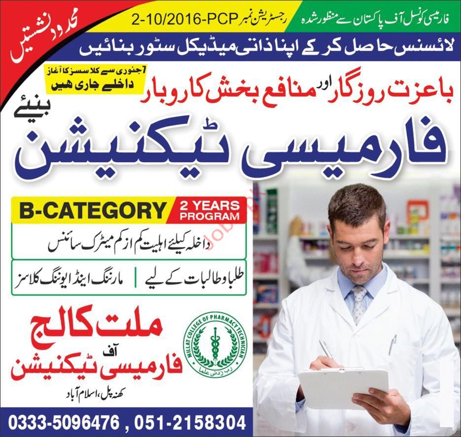 Millat College for Pharmacy Technician Admissions 2019