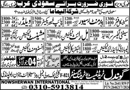 Nowsherwan International Overseas Employment Promoters Riyadh, dammam Saudi Arabia invites applications from eligible candidates for the post of 3g welder, welder, electrical technician, millwright technician, machinist technician, permit receiver, hydraulic technician, laboratory technician, safety officer, 6g welder, instrument technician, pipe fabricator and mechanical fitter as per advertisement of June 29, 2024 published in daily Express Newspaper. Persons with Matric, DAE, Intermediate and Bachelor etc. education can apply.