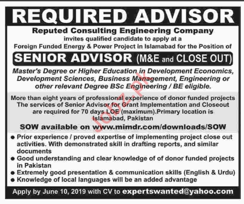 MIMDR Project Islamabad Jobs 2019 for Senior Advisor