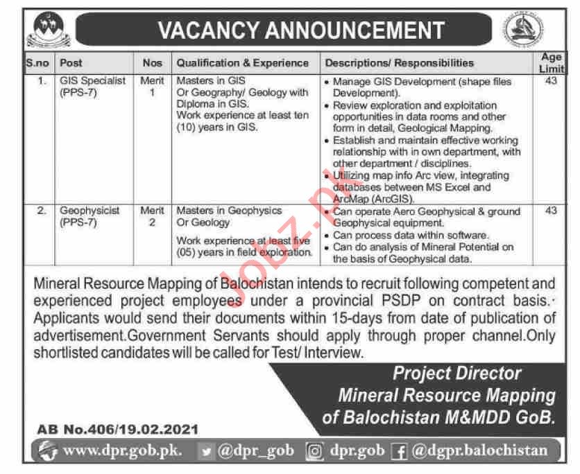 Vacancies in Mines & Minerals Department Advertisement February 2021