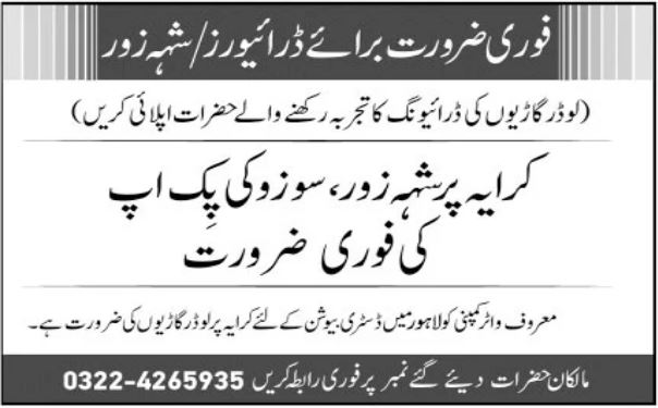 Vacant posts including driver are announced in Mineral Water Company Multan, multan Punjab Pakistan as per 20 February 2022 advertisement in daily Jang Newspaper. Persons with Matric and Middle etc. education can apply.