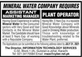 Vacancies in Mineral Water Company Advertisement July 2021