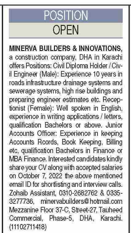 Minerva Builders & Innovations jobs advertisement dated about 5 October 2022 in daily Dawn Newspaper invites application for the vacant post of receptionist, accounts officer, engineer and civil engineer in Karachi, karachi Sindh Pakistan. Preferred Education is DAE, MBA, Bachelor and Intermediate etc.