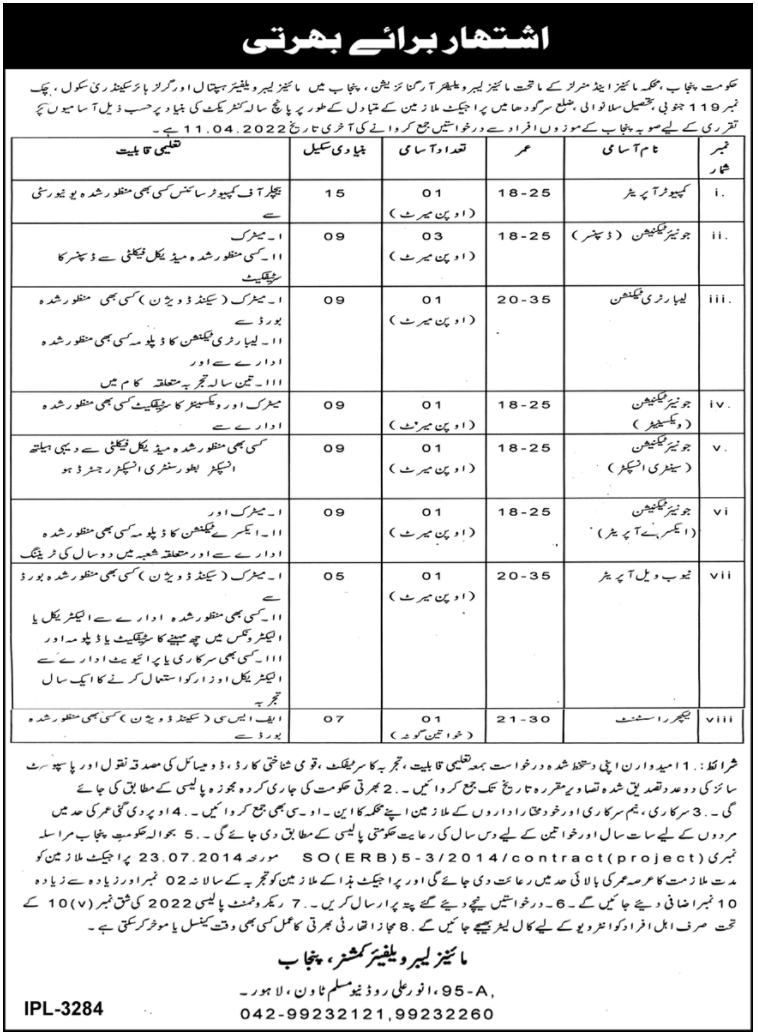 Mines Labor Welfare Organization Lahore is looking for candidates for following posts as per job advertisement published in daily Nawaiwaqt Newspaper of March 28, 2022 for location Lahore Punjab Pakistan:
