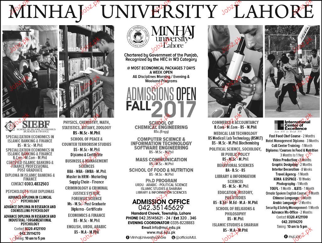 MinHAJ University Chartered Government of the Punjab Recognized University Admission in BS, MSC, MA, DBA, EMBA, MS, BA, Diploma, and Mphill in Lahore. Read newspaper ad for exact details.