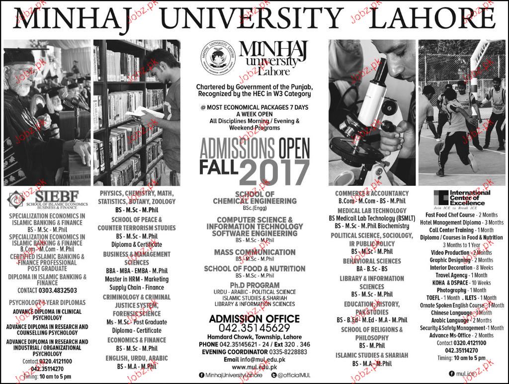 Minhaj University Chartered Government of the Punjab Recognized University Admission in BS, MSC, MA, DBA, EMBA, MS, BA, Diploma, and Mphill in Lahore. Read newspaper ad for exact details.