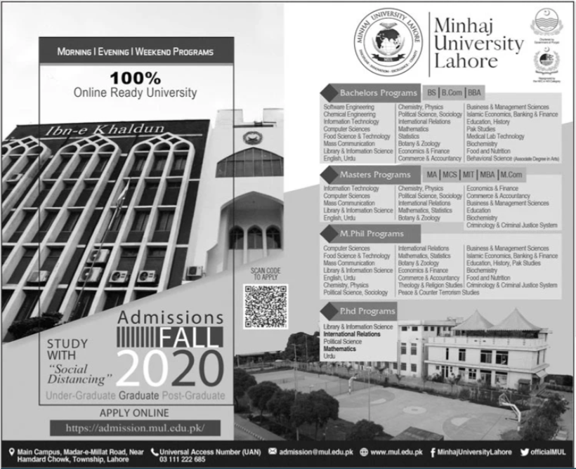Minhaj University Lahore is a private university has announced admissions in BS, B-Com, BBA, MA, MCS, MIT, MBA, M-Com, Bachelors Programs, Masters Programs, M.Phil Programs and PhD Programs. Read newspaper ad for exact details.