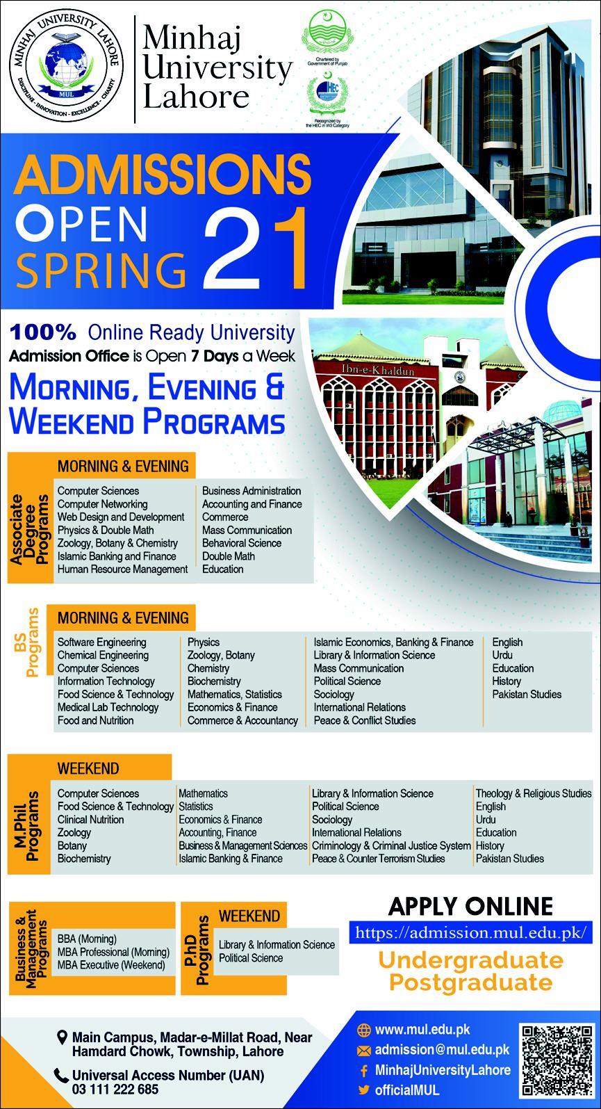 Minhaj University Lahore MUL is a private sector university invites applications for online admissions in ADP, BS, M.Phil, BBA, MBA, PhD degree programs 2021. Read newspaper ad for exact details.