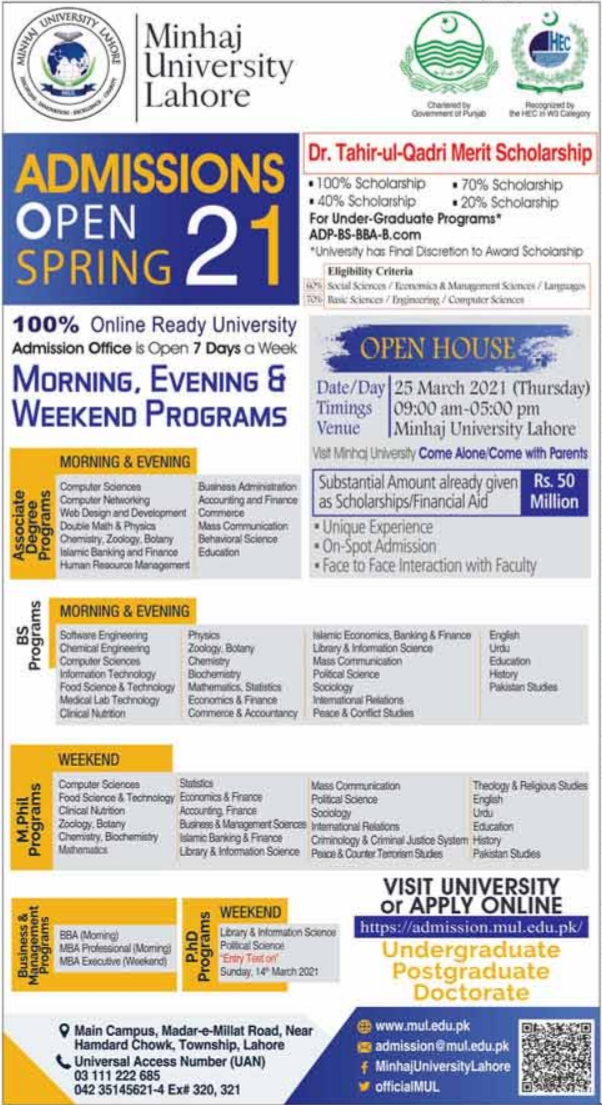 Minhaj University Lahore MUL is a private university invites applications for online admissions in ADP, BS, M.Phil, BBA, MBA and PhD degree programs 2021. Read newspaper ad for exact details.