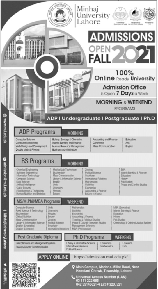 The Minhaj University Lahore MUL is a private university invites applications for admissions in ADP Programs, BS Programs, MS Programs, M.Phil Programs, MBA Programs, Post Graduate Diploma & PhD Programs. Read newspaper ad for exact details.