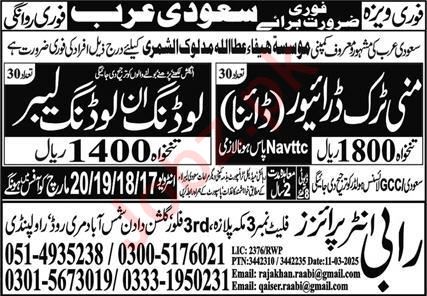 Raabi Enterprises Riyadh, riyadh Saudi Arabia invites applications from eligible candidates for the post of mini truck driver and loading unloading labor as per advertisement of March 16, 2025 published in daily Express Newspaper. Middle etc. educational qualification will be preferred.