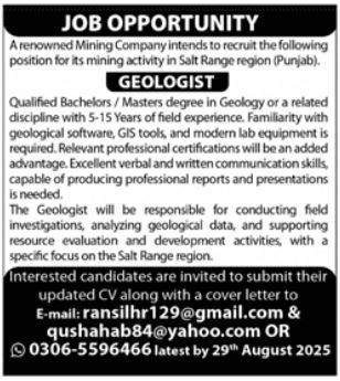 Mining Company Lahore, lahore Punjab Pakistan invites applications from eligible candidates for the post of geologist as per advertisement of August 17, 2025 published in daily Jang Newspaper. Master, Bachelor and MS etc. educational qualification will be preferred.