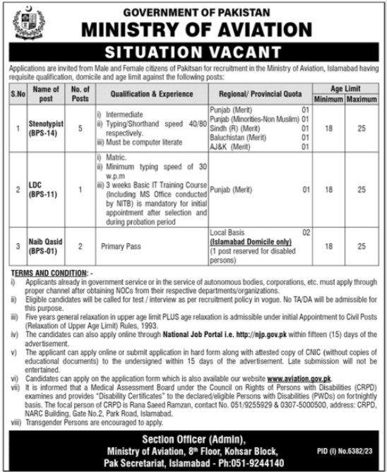 Ministry of Aviation Islamabad, islamabad Islamabad Pakistan invites applications from eligible candidates for the post of naib qasid, ldc and stenotypist as per advertisement of April 25, 2024 published in daily Jang Newspaper. Candidates with Intermediate, Primary and Matric etc. educational background will be preferred.